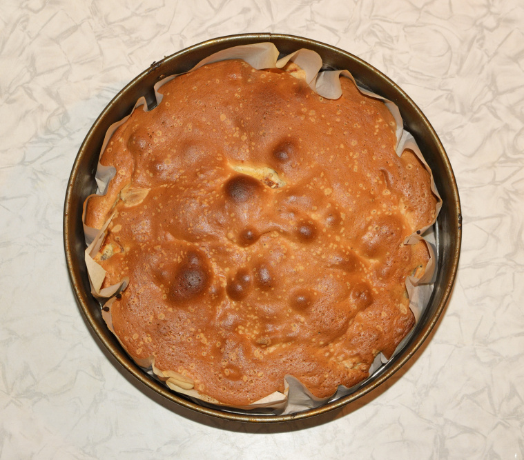 - Gotowe ciasto wylej na gruszki i rozprowadź równomiernie po całej tortownicy.