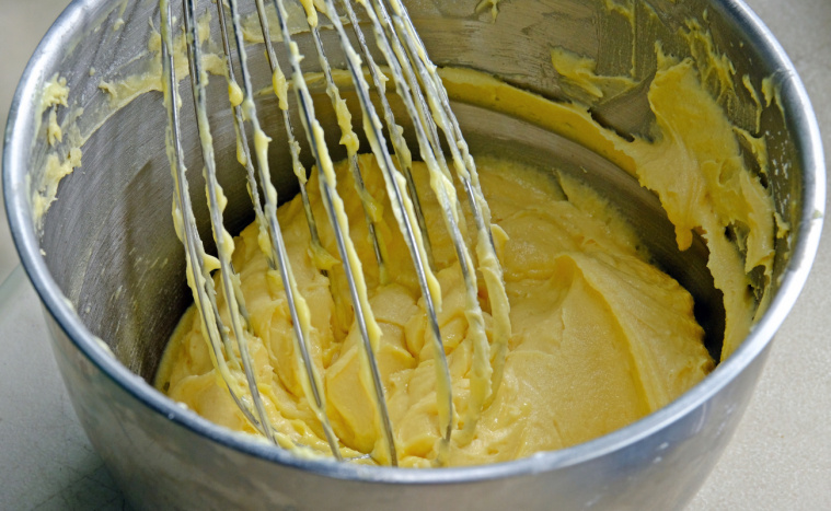- Zacznij do przygotowania nadzienia – najlepiej zrobić to dzień wcześniej, aby masa stężała w lodówce. Włóż żółtka jaj do garnuszka i lekko ubij je trzepaczką. Następnie wsyp cukier i mieszaj, aż masa nabierze jaśniejszego koloru.