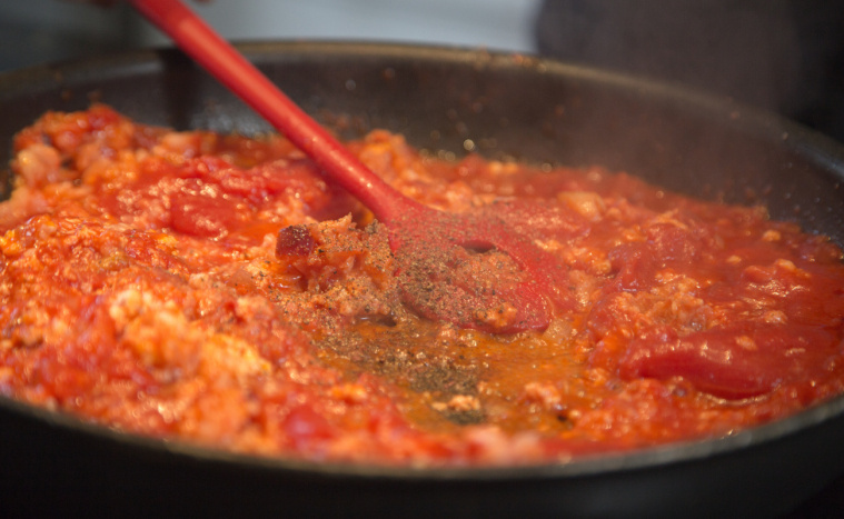 - Dodaj do mięsa pomidory z puszki, bazylię, oregano, koncentrat i dopraw solą i pieprzem.