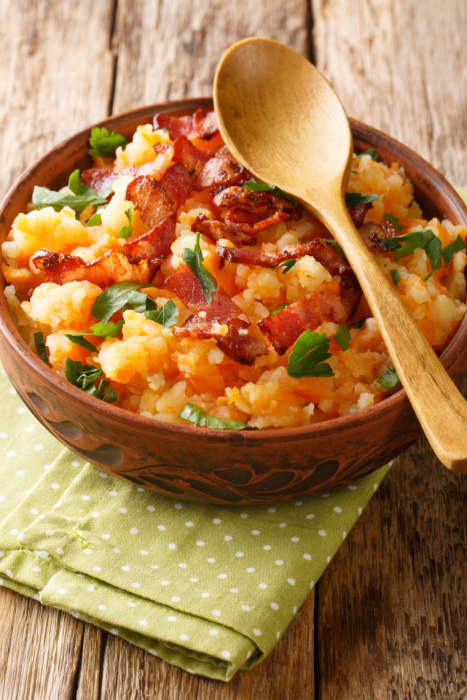 To danie nie wymaga żadnych egzotycznych produktów, nie musisz też niczego planować z wyprzedzeniem. Wystarczy mieć w domu ziemniaki. W tym konkretnym przepisie wykorzystuję ziemniaki, marchewkę, wędzony boczek i cebulę. Do tego trochę masła, sól, pieprz – i gotowe. Jeśli chcesz, na koniec możesz posypać wszystko świeżą natką lub jarmużem. Nie miksuj ziemniaków na gładkie puree – powinny zostać lekkie grudki, które dają daniu charakter.