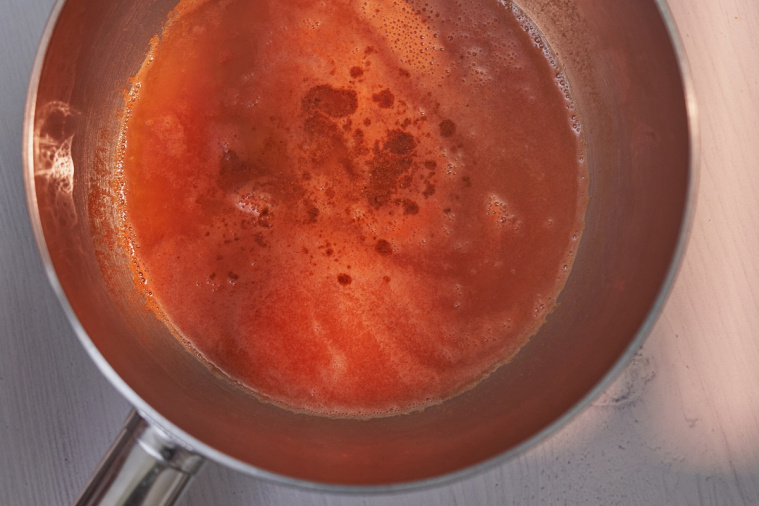 Do naczynia wlej 660 ml soku marchewkowego tłoczonego i 200 ml soku jabłkowego tłoczonego na zimno. Dodaj 160 g cukru i dokładnie wymieszaj jeszcze przed podgrzewaniem. Ten pierwszy etap jest prosty, ale ważny, bo cukier powinien dobrze rozpuścić się w płynie. Dzięki temu nie będzie osiadał punktowo na dnie i nie zacznie się nierówno podgrzewać. Następnie doprowadź całość do wrzenia, a kiedy pojawią się bąble, zmniejsz ogień do średniego.