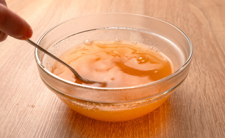 - Przelej 700 ml soku z mandarynek do rondelka, podgrzej nieco i rozsyp na wierzchu soku 4,5 łyżeczki żelatyny. Pozwól jej nasiąknąć, a potem zdejmij rondelek z ognia i mieszaj, aż żelatyna się rozpuści.